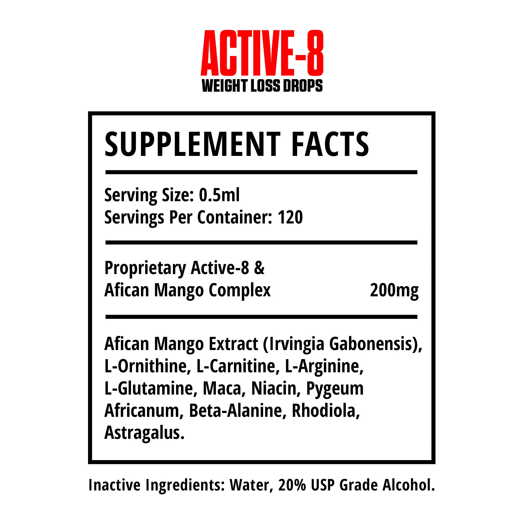 Gotas para bajar de peso Active-8 Queme el exceso de grasa y desarrolle músculos magros con nuestras gotas para bajar de peso Activ-8, las más vendidas. Estas gotas utilizan los efectos estimulantes del metabolismo del extracto de mango africano para estimular el crecimiento muscular, convertir la grasa en energía y promover la pérdida de grasa. Agregue unas gotas al día a su rutina para obtener resultados reales en la pérdida de peso.