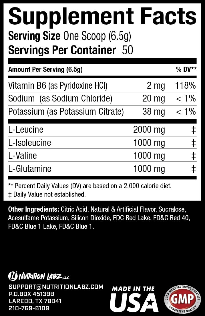 Nutrition Labz BCAA ofrece una mezcla de 5 g de BCAA con glutamina y vitamina B6 para una mejor absorción y eficacia. Tiene la proporción ideal de 2:1:1 de leucina, isoleucina y valina, es vegano, instantáneo para una rápida disolución y viene en un sabor increíble con 50 porciones por botella.